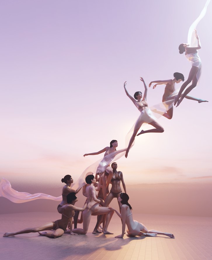 The artwork depicts women supporting and elevating one another, forming a shifting structure that reaches toward the sky. As they move, the balance between strength and vulnerability emerges, reflecting the power of collective resilience. The piece invites viewers to consider how unity shapes progress and what it means to rise together.