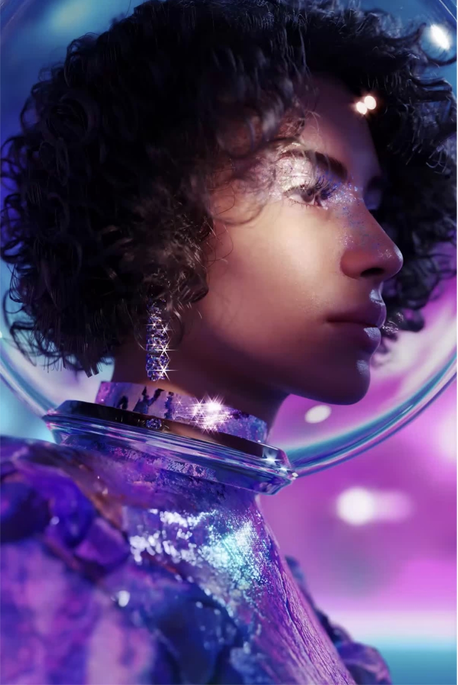 Stargazer's Dream invites the observer into a universe filled with wonder, curiosity, and infinite possibilities. It features a model, whose eyes are filled with stars, as she gazes into the celestial abyss. Her connection with the cosmos is not merely an infatuation but a deep understanding and passion for what lies beyond. Through this mesmerizing piece, the infinite expanse of space is not just an abstract concept but a tangible dream, sparkling with mysteries waiting to be explored.