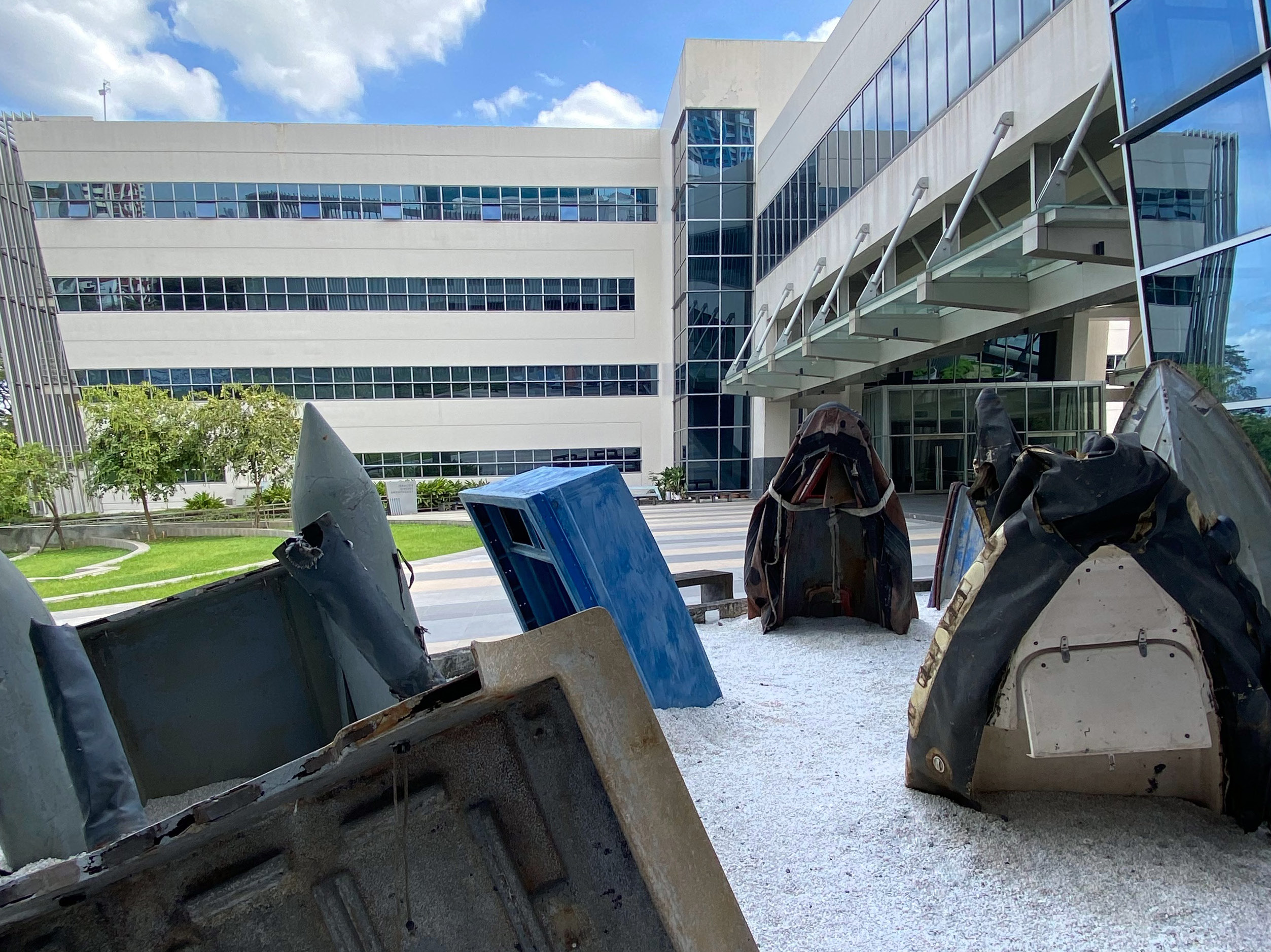 Hard Rain is an installation composed of more than a hundred rusted steel scrap components sourced from decommissioned twentieth-century industrial artifacts. These inert reclaimed steel casings were collected over a decade from Nueva Vizcaya and the Ifugao Province in the Philippines. Local villagers unearthed discarded steel fragments and dismantled vessel parts from long-abandoned scrap sites, selling them to antique pickers for modest earnings that often helped meet daily needs.